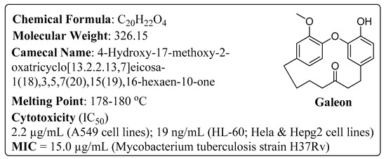 Metabolic profiling of known/unknown and natural/synthetic molecules has become attractive to scientists due to the fact of its importance in drug discovery and development. Understanding how a compound is metabolized enables identification and analysis of its potential metabolites and guides the design of molecules with a reduced risk of drug-drug interactions or variations in exposure across the patient population. Drug metabolism can generate chemically reactive metabolites which are, in most cases, responsible for the unexpected toxicities of a drug, as they tend to react with cellular components [1,2], such as DNA and proteins, leading to mutagenicity, teratogenicity or carcinogenicity [3]. This is a major issue for patient safety and sometimes leads to drug withdrawals or use restriction. Therefore, it is important to study the metabolic profile before a drug molecule goes into clinical use [1,2]. In addition, bioavailability, which is partially attributed to the first-pass metabolism of a drug, plays an important role in ensuring a drug reaches its site of action to elicit its function. Based on the metabolic performance of a potential drug molecule, the clinical application can then proceed accordingly. Although a large number of natural/synthetic molecules have been reported to have potent biological activities, their further development is hampered due to the fact of their poor bioavailability and toxicity (i.e., generation of toxic reactive metabolites). Recently, a number of articles have been published reporting on the synthesis, biological evaluation, and metabolic profiling of natural/synthetic potential of drug molecules [4,5,6,7,8,9,10,11,12,13,14]. Galeon (Figure 1), a natural cyclic-diarylheptanoid (CDH), was first isolated from Myrica gale L. in 1976 by Malterud et al. [13], and many other research groups have reported it from different plant species [11,12,15,16,17,18,19,20,21,22], showing it to have potent biological activities; cytotoxicity against human cancer cell lines A549 (IC50 = 2.2 µg/mL) [11], HL-60 (60.33 µmol/L), HeLa (58.21 µmol/L), Hepg2 (63.34 µmol/L) [21], T47D, MCF7, HCT15, and HeLa; anti-tubercular activity against Mycobacterium tuberculosis H37Rv in vitro (MIC = 15.0 µg/mL) [18]; chemo-preventive potential [23]; moderate topoisomerase inhibitory activity [4]. Its intriguing molecular structure and various biological properties have led to the establishment of several synthetic methods [4,24,25,26,27,28], which made it possible to pursue its metabolic as well as other additional studies during the development process of the new drug. Recently, we synthesized a series of linear/cyclic-diarylheptanoids (CDHs) and confirmed their cytotoxicity and topoisomerase inhibitory activity [4,6]. As a continuing interest on cyclic diarylheptanoids [4,6,28], we herein report, firstly, in silico prediction of the metabolites of galeon, a natural cyclic-diarylheptanoid (CDH), using the CYP450 module of the StarDrop software [29,30,31], where it used its WhichP450 model to inform us which CYP450 isoforms were the most likely to be responsible for the Phase I metabolism of a compound, and combined with the models of regioselectivities of metabolism by each isoform, the WhichP450 model aided in the prediction of the metabolites most likely to be formed by P450-mediated metabolism. Secondly, we report the metabolite alert sites and toxicity prediction using the Deductive Estimation of Risk from Existing Knowledge (DEREK) software [32,33,34,35], which uses a knowledge-based expert system to predict the toxicity and metabolism of a chemical, facilitating the possibilities of faster scientific progress and reductions in the use of animals in testing [36]. Thirdly, we report on galeon’s metabolic profile through in vitro metabolic experiments using rat liver microsomes (RLMs) in which identification of possible metabolites and confirmation of their structures were carried out using Ion-trap tandem mass spectrometry (LC-MS/MS). Finally, we conducted molecular docking analysis [37] in order to identify the binding mechanism of galeon with all CYP450 isoforms.
