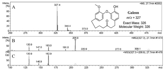 Mass spectra of galeon: (A) MS spectrum; (B) MS2 spectrum; (C) MS3 spectrum.