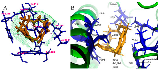 Secondly, galeon was docked with the CYP2E1 isoform which showed a 96% metabolic profiling, and the results are shown in Figure 6. Galeon and CYP2E1’s interaction involved Ile115, Phe207, Phe298, Ala299, Thr303, Val364, Leu368, and Phe478 residues (Figure 6A). The amino acid residues Phe207 and Thr303 were involved to form π–donor hydrogen bonds interactions with H of the –OH group; Phe298 and Phe478 by π–π T-shaped interactions; Ile115, Ala299, Val364, and Leu368 by π–alkyl interactions. According to CYP2E1’s crystal structure [39], the main binding site for ligands were Phe106, Phe116, Ile115, and Val364. Galeon would, thus, interact with Ile115 among these residues of the active site. Thr303’s polar side chain lining the active site cavity was highly conserved which interacted with galeon via hydrogen bonding. This residue may play a similar role in the positioning of smaller substrates. Evidence suggests that this conserved Thr303 plays an important role in proton delivery to the active site in other P-450 enzymes [40,41]. In addition, CYP2E1 [42], Val364, Leu368, and Phe478 would form a constriction between the active site cavity and access channel thereby helping the translocation of the substrate. The location of the main residues involved is depicted in Figure 3, where Ile115 belongs to the B’-Helix, Val364 and Leu368 belong to the loop between Helix-K and beta 1-4, Phe478 belongs to the beta 4-1/4-2 turn, and Thr303 belongs to the Helix-I (Figure 6B).