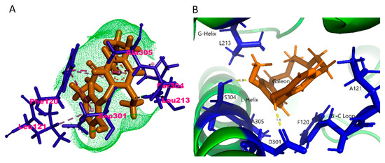 Docking analysis for galeon with the CYP2D6 isoform with a 93% metabolic profiling is shown in Figure 8. One of the important interaction sites involved between CYP2D6 and galeon is Phe120 in the B’–C loop, which plays key roles for two π–π stacked bonding between the benzene rings, Leu121 in the B’–C loop for π–alkyl interaction, and Leu213 in the G-helix region for one T-shaped π–π bonding. In addition, Asp301 in the L-Helix region was involved in the interaction with the H of –OH group via conventional hydrogen bonding, Ser304 and Ala305 in the L-helix via hydrogen bonding as well as π–π stacked T-shaped π–π interaction (Figure 8A,B). The docking analysis data clearly showed that galeon interacted with the residues mostly present in the L-helix, G-helix, and B’–C loop region. The crystal structure of CYP2D6 suggests that an active site cavity would be formed by residues from the B-helix, the B′–C loop (side chains of Leu-110, Phe-112, Phe-120, and Leu-121 and the main chain atoms of Gln-117, Gly-118, Val-119, and Ala-122), the F-helix (side chains of Leu-213, Glu-216, Ser-217, and Leu-220), the G-helix, the L-helix (side chains of Ile-297, Ala-300, Asp-301, Ser-304, Ala-305, Val-308, and Thr-309), the loop between K-helix and β sheet 1 strand 4, and residues from the loop between the strands of the β sheet 4 [43].