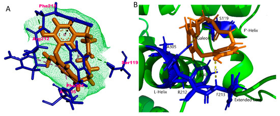 Finally, a docking analysis was performed for galeon with the CYP3A4 isoform with an 81% metabolic profile (Figure 9). It should be noted that, the CYP3A4 isoforms are not present in the rat liver microsomes (RLMs) but in the human liver microsomes (HLMs). Galeon interacted with Ser119 of CYP3A4 in the F-helix via hydrogen bonding with =O group, Arg212 in the L-helix by H-bonding and pi-alkyl bonding, respectively, with the –OCH3 group and the corresponding benzene ring, Phe213, in the extended loop by H-bonding and T-shaped π–π bonding, respectively, with the –OH group and the corresponding benzene ring, Phe304, in the L-helix via π–alkyl interaction with the center of the compound, and Ala305 in the L-helix by π–alkyl interaction with benzene ring of the –OCH3 group. Structural analysis revealed that [44] Phe213 and Phe215 form the active site and, together with another five phenylalanine residues (Phe108, Phe219, Phe220, Phe241, and Phe304), form a “Phe-cluster”, which have also been shown by mutagenesis studies to be involved in CYP3A4 activity. Ala305 is highly conserved and functionally important for enzymatic activity. Galeon successfully made important interactions with Phe-cluster residues thus showing the highest metabolic sites within galeon and proving to be a superior metabolic substrate (Figure 9A,B).