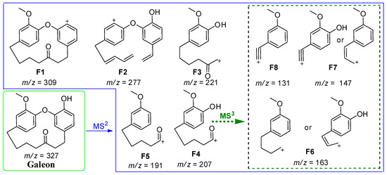 The MS2 fragmentation of galeon (m/z 327) gave major fragments at m/z 309 (F1), 277 (F2), 221 (F3), 207 (F4), 191 (F5), 163 (F6), 147 (F7), and 131 (F8), and the MS3 fragmentation of the major fragment F4 (m/z, 207) gave F6, F7, and F8 (Figure 4B,C). The MS2 and MS3 fragments and their possible structures are depicted in Scheme 1.