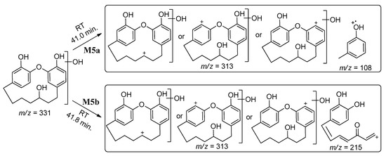 The metabolites M5a/b were tentatively identified as demethylated, reduced with hydroxylated metabolite of galeon at m/z 331. Protonated molecular ion peaks at the retention times 41.0 min and 41.8 min gave an m/z 331 [M + H]+ (Figure S5(aA), Figure S5(bA)) with a mass shift of 4 Da compared to the parent. The MS2 experiments of m/z 331 at 41.0 min and 41.8 min gave fragments at m/z 313 and 108 for M5a (Figure S5(aB)) and m/z 313 and 215 for M5b (Figure S5(bB)), respectively. The MS/MS2 spectra are shown in Supplementary Materials Figure S5a,b, and the fragmentation patterns with possible structures of the metabolites are proposed in Scheme 6. Those fragments for M5a and M5b were only possible if the corresponding compounds were produced by the proposed metabolic reactions.