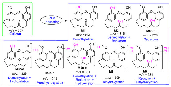 As shown in the schemes, there were three types of possible metabolic reactions (i.e., demethylation, reduction, and mono/di-hydroxylation) that occurred in galeon incubation with a total of eighteen metabolites: demethylated (M1, m/z 313); demethylated with carbonyl reduced (M2, m/z 315); carbonyl reduced only (M3a/b, m/z 329) and/or demethylated with hydroxylated (M3c/d, m/z 329); mono-hydroxylated (M4a–h, m/z 343); demethylated with reduced and mono-hydroxylated (M5a–b, m/z 331); di-hydroxylated (M6, m/z 359), and di-hydroxylated with reduced (M7, m/z 361).