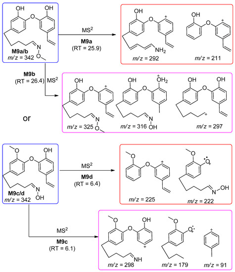 The metabolites M9a/b or metabolites M9c/d were tentatively identified as oxidative alkylation, demethylation followed by oxime formation or oxidative alkylation followed by oxime formation, demethylation in oxime metabolite of galeon at m/z 342. Protonated molecular ion peaks at the retention times 25.9 min and 26.4 min gave m/z 342 [M + H]+ (Figure S9(a/bA,a/bC)) with a mass shift of 15 Da compared to the parent. The MS2 experiments of M9a/b at 25.9 min and 26.4 min at m/z 342 gave fragments at m/z 292 and 211 (Figure S9(a/bB)) and m/z 325, 316, and 297 (Figure S9(a/bD)), respectively. Another set of peaks with the same molecular mass (m/z 342 [M + H]+) was observed at 6.1 and 6.4 min, which possibly were isomers of 9a/b and 9c/d (Figure S9(c/dA)) having a free oxime group. Fragmentation of each peak gave fragments at m/z 298, 179, and 91 (Figure S9(c/dB)) and m/z 225 and 222 (Figure S9(c/dC)), respectively. Based on the fragmentation pattern, the possible structures of the metabolites are proposed in Scheme 11, and these fragments are only possible if the structures are the same as depicted for M9a–d.