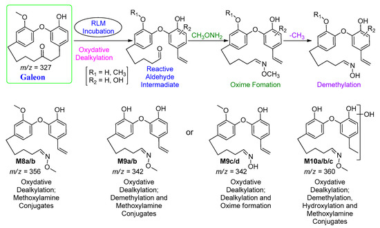 In the second part of the metabolic study, we tried to identify the possible reactive metabolites by incubating galeon with RLMs in the presence of 2.5 mM N,O-dimethylhydroxylamine (MeNHOCH3) and 1.0 mM GSH, respectively. Following the extraction of the incubation mixtures, 10 µL of the samples were injected into an LC-MS/MS instrument for analysis. Based on the peak area of the formed metabolites, the hydroxylation pathway was proposed to be the major metabolic pathway for galeon after demethylation or with demethylation. A total of nine conjugates with four types of methoxylamine conjugates and three GSH conjugates were detected (Table 3).