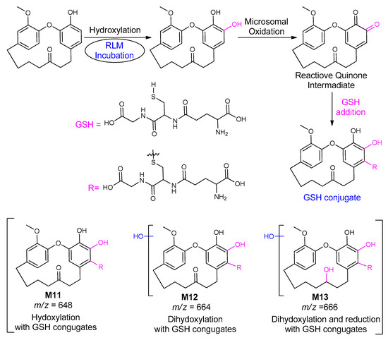 Possible detected metabolic reactions and their proposed structures are depicted. Rat liver microsome, (RLM).