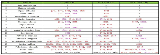 In the D2 domain, out of six amino acid long sequences, the polarity of three amino acids was conserved across eighteen species, and among them, one amino acid was a binding residue. Homo sapiens, Pan troglodytes, Macaca mulatta, Pteropus vampyrus, and Pteropus alecto were grouped together since the overall polarity of their amino acid chain was found to be similar, and, simultaneously, Danio rerio, Mustela putorius furo, Gallus gallus, and Pelodiscus sinensis were placed together. In addition, three groups comprising Manis javanica, Capra hircus, Bos taurus, Sus scrofa, Rattus norvegicus, and Rhinolophus ferrumequinum, respectively, were placed in close proximity based on their polarity and non-polarity of the amino acids in the protein sequence. However, Equus caballus, Felis cattus, and Mesocricetus auratus were placed separately since they did not show much resemblance based on polarity.