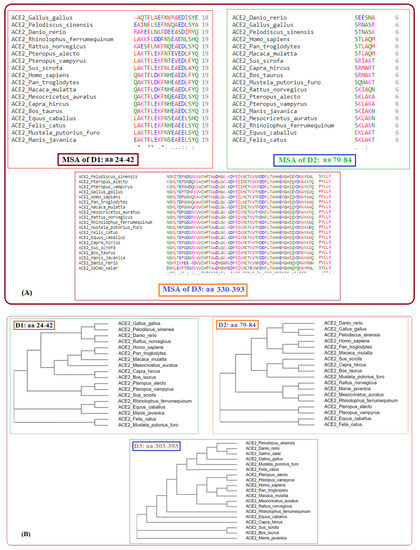 Multiple sequence alignments of D1, D2, and D3 domains of ACE2 of nineteen species (A) and respective phylogenies (B).