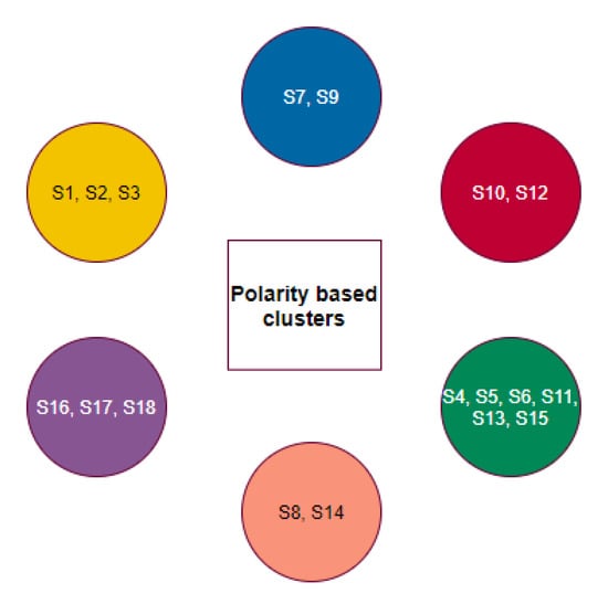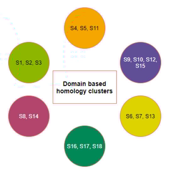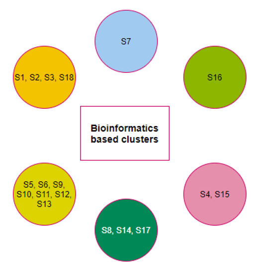 A final set of six clusters was formed using the K-means clustering method to have all three domains for eighteen different species (Figure 10). Although the species S7 was clustered with the species S5 and S11 as per full-length ACE2 sequence homology, S7 formed a unique singleton cluster when the bioinformatics features were taken into consideration. Similarly, the species S16 formed a singleton cluster though it was clustered with S17, S18, and S19 as per the amino acid homology of ACE2. The sequence homology of ACE2 made the four species S16, S17, S18, and S19 into a single cluster, but bioinformatics features placed the species S18 in a cluster where the other three species S1, S2, and S3 belonged. Based on bioinformatics features, S4 clustered together with S15 though the ACE2 receptor of S4 was sequentially similar to ACE2 of S9, S10, and S12.