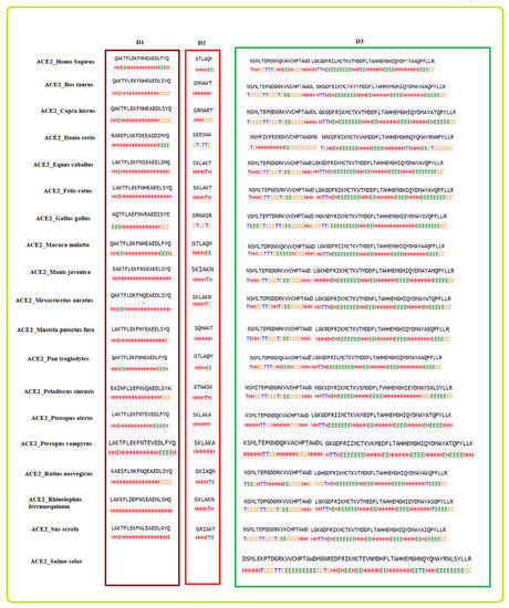 For each existing domain of ACE2 of the nineteen species, the secondary structure was predicted (Figure 4). For each domain, species are grouped into several subgroups.