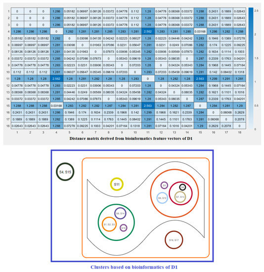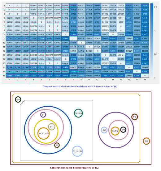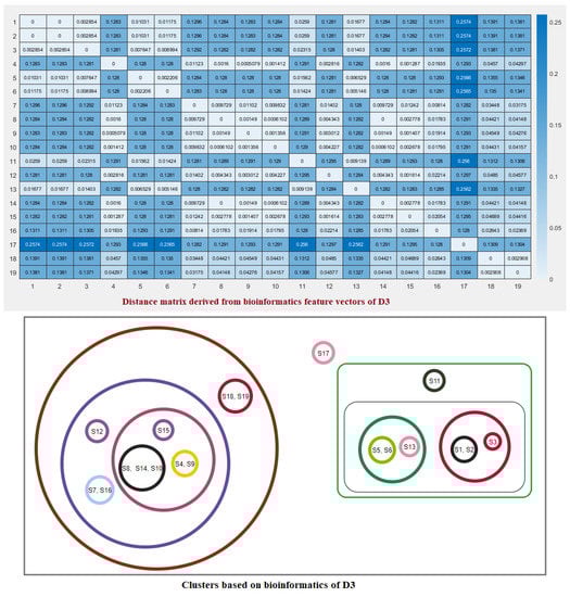 Note that here and denote the ith feature for the species S and T, respectively. These distance matrices with heatmap representation for all three domains are presented in Figure 7, Figure 8 and Figure 9. In addition, by inputting the distance matrix, using the K-means clustering technique, several clusters of species were formed for D1 and D2 domains in eighteen species (Figure 7 and Figure 8) and D3 domain in all nineteen species (Figure 9).