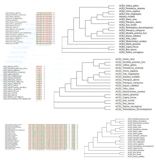 - Sang, E.R.; Tian, Y.; Gong, Y.; Miller, L.C.; Sang, Y. Integrate structural analysis, isoform diversity, and interferon-inductive propensity of ACE2 to predict SARS-CoV2 susceptibility in vertebrates. Heliyon 2020, 6, e04818. [Google Scholar] [CrossRef]