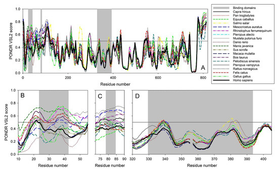 Per-residue intrinsic disorder predisposition of ACE2 proteins. (A) Peculiarities of the intrinsic disorder distribution within the amino sequences of ACE2 protein from nineteen species analyzed in this study. Light gray vertical bars show the location of the ACE2 regions responsible for interaction with SARS-CoV-2 S protein, domains D1 (residues 24–42), D2 (residues 79–84), and D3 (residues 330–393). (B–D). Zoomed-in disorder profiles focusing at the domains D1 (B), D2 (C), and D3 (D) responsible for the ACE2-S interaction. Disorder predispositions were evaluated using the PONDR® VSL2 algorithm.