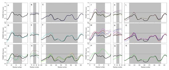 Peculiarities of intrinsic disorder predisposition within the D1 (A,D,G,J,M), and (P), D2 (B,E,H,K,N), and (Q), and D3 domains (C,F,I,L,O), and (R) of ACE2 proteins from cluster 1 (A,B), and (C), cluster 2 (D,E), and (F), cluster 3 (G,H), and (I), cluster 4 (J,K), and (L), cluster 5 (M,N), and (O), and cluster 6 (P,Q), and (R). For keys, see Figure 14.