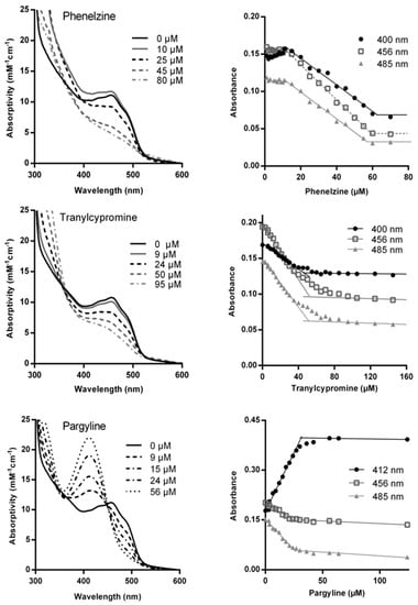 Changes in the visible spectrum arising from the FAD have long been used to investigate the redox status and adduct formation. The spectral changes associated with adduct formation in MAO-A were confirmed for the three classical types of mechanism-based inhibitors by adding aliquots of the inhibitor to purified MAO-A and incubating for 15 min at 30 °C before recording the spectrum (Figure 6). As previously observed [11,18,24,44,45,46], the propargylamine adduct is associated with a large increase in the absorbance in the 410 nm region (Figure 6 bottom and Figure S3 in Supplementary Information). No such distinctive feature is seen for tranylcypromine inactivated MAO-A (Figure 6 middle), nor for phenelzine (Figure 6 top). Despite the fact that crystal structures show that all three compounds form adducts with flavin cofactor (Figure 1B), the spectral changes are different. For reference, the extinction coefficients for the changes at key wavelengths, calculated from the spectral titrations shown in Figure 6, are provided in the Supplementary Information Table S1, along with previously published values for reduction of MAO-A in the absence of ligand.