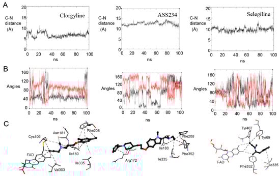 Interactions of propargylamine ligands with oxidized MAO-A. Left: clorgyline; Middle: ASS234; Right: selegiline. (A) Poses: clorgyline (at 67 ns of trajectory); ASS234 (at 75 ns); selegiline from its productive pose (at 100 ns). (B) Atom plot distances from ligand Cα to N5-FAD calculated over 100 ns of simulation. The selegiline trajectory (right) started from the productive pose in which the propargyl group pointed towards the FAD. (C) Angle N5…H-C.