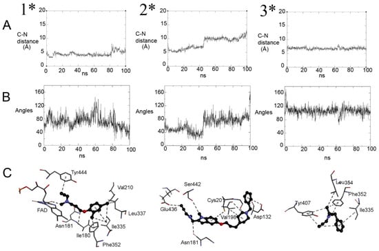 Orientation and movement of allenyl products in the active site of MAO-A. (A) Atom plot distances for the imine C-terminal to N5-FADH−. (B) Angle N5 to C=C=C. (C) interactions between allenyl products and reduced MAO-A. Columns from left to right, the compounds are: left: oxidized product from clorgyline (1*); middle: oxidized product from ASS234 (2*); right: oxidized product from selegiline (3*).