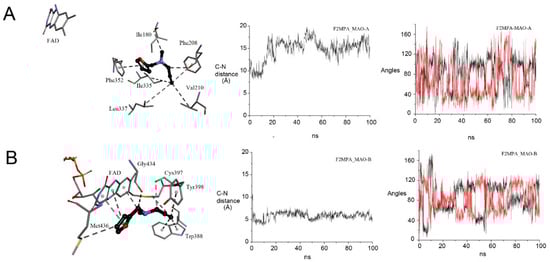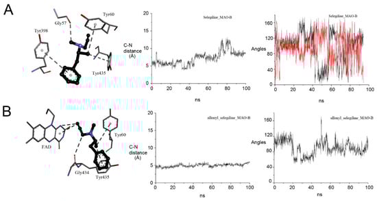 Orientation and movement of selegiline and its allenyl product in the active site of MAO-B. (A) Oxidized MAO-B with selegiline; (B) reduced MAO-B with the allenyl-imine product from selegiline oxidation. Left: interactions in the active site; Middle: atom plot distances of the α-carbon to N5 of FAD (top) or imine C-terminal to N5-FADH− (bottom); Right: the angle to FAD or FADH−.