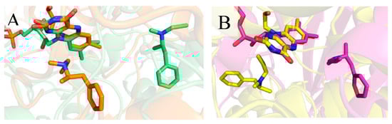 Overlay of selegiline in MAO-A and MAO-B. (A) Selegiline locations in the active sites of oxidized MAO, with MAO-A as green sticks and MAO-B as orange sticks. (B) Allenyl-selegiline locations in reduced MAO, with MAO-A as magenta sticks and MAO-B as yellow sticks.