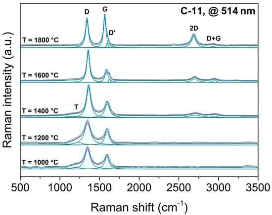The prepared silicon oxycarbides were investigated by means of Raman spectroscopy. Figure 1 displays the visible Raman spectra (λ = 514 nm) of the sample C-11, which was heat-treated in argon at different temperatures from 1000 to 1800 °C. The Raman spectrum of the sample prepared at 1000 °C exhibited two broad signals at ca. 1330 cm−1 and ca. 1610 cm−1 representing the D and G modes, along with a broad, low-intensity signal at 1120 cm−1, the so-called T band [45]. No significant change is observed in the Raman spectra of the C-11 samples heated at temperatures up to 1400 °C. However, in the spectrum of the sample annealed at 1400 °C, the T band, related to residual sp3 carbon, nearly vanished and the full width at half maximum (FWHM) of the D band significantly narrowed along with an increasing intensity. By comparing the spectra of the samples heat treated at 1400 and 1600 °C, it could be concluded that the width and intensity of the G band did not significantly change, though a small shoulder around 1620 cm−1 arose. This signal was assigned to the D’ band [45,46,47] and indicate the evolution of small nano-graphitic clusters in the silicon oxycarbide sample. This has been substantiated by the appearance and development of two signals (2D and D + G) in the second-order spectrum.
