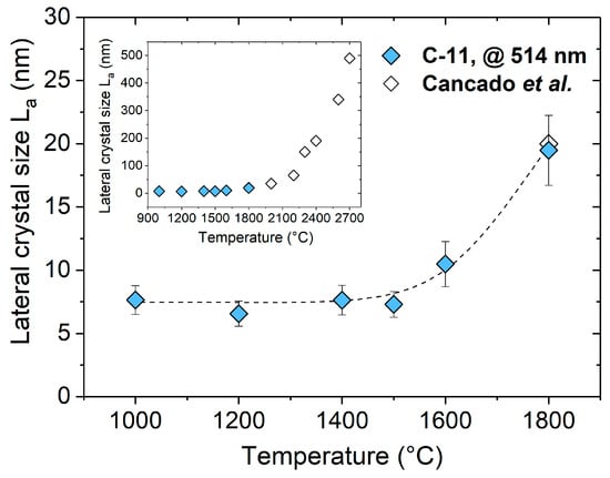 with λl being the laser wavelength. As clearly indicated in Figure 2, the lateral crystal size La was not affected by the treatment temperature in the temperature range from 1000 to 1500 °C and only slightly varied around a value of ca. 7.5 nm. This is in agreement with the work of Takai et al. who obtained similar values (La = 5–7 nm) for amorphous carbon films heat treated at temperatures up to 1500 °C. At higher temperatures, the crystalline lattice started to grow, as intrinsic lattice defects were removed. The onset of graphitization was emphasized by the increase in intensity of the G band and the clear development of D’ at temperatures beyond 1600 °C, as shown in Figure 1. Thus, the La value found in the C-11 sample annealed at 1800 °C was ca. 20 nm. This is in excellent agreement with a study of Cançado et al. who investigated the graphitization behavior of diamond-like carbon thin films at temperatures ranging from 1800 to 2700 °C, which revealed a La value of 20 nm for the films annealed at 1800 °C [50] (see empty symbols in the inset of Figure 2).