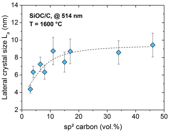 As the series of SiOC/C samples in the present study showed, the content of the segregated carbon phase in the prepared materials can be adjusted in a broad range. Within this context, Raman spectroscopic investigations were done in order to rationalize whether the amount of segregated carbon in SiOC/C ceramic might have an effect on the lateral crystal size La. Figure 3 plots the La as a function of the volume fraction of the segregated carbon phase in the studied SiOC/C ceramics and revealed a constant La value of 9 ± 1 nm for samples showing carbon contents above ϕC > 10 vol.%; whereas the samples possessing of lower carbon contents, (ϕC < 10 vol.%) exhibited smaller La values of 6 ± 2 nm. Thus, it may be concluded that the large(r) amount of segregated carbon in silicon oxycarbides correlates to its relative higher graphitization degree [39].