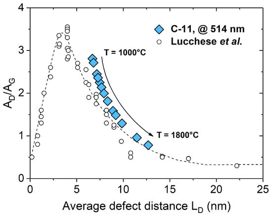 In Figure 4, the AD/AG ratio in C-11 samples annealed at different temperatures was plotted as a function of the LD value. It is clearly shown that AD/AG decreased and LD increased as the annealing temperature of C-11 increased from 1000 to 1800 °C. In the C-11 sample prepared at 1000 °C, a LD value of 6 nm was obtained, which means that at least one defect is present within the average lateral size of the crystallite (La (1000 °C) = 7.5 nm). By increasing the annealing temperature up to T = 1400 °C, LD increased giving values in the range of LD = 8–10 nm. This correlated to the appearance end evolution of the D’ band in the Raman spectra of the corresponding samples and was similar to the behavior and evolution of nano-graphitic structures. Upon annealing at higher temperatures, the concentration/number of the intrinsic defects was further reduced, giving rise to larger LD and La values. This is an expected trend, which agreed very well with the description of Ferrari et al. who identified two stages concerning the evolution of the ID/IG ratio: the first stage corresponded to a high defect concentration situation in the carbon phase and there the ID/IG ratio scales with La cf. ID/IG = 1/La2; whereas the stage two corresponded to a low defect concentration in carbon, with ID/IG = 1/La [45]. Considering the proposed La value of ca. 2 nm as a border between the first and second stage and the values obtained for the studied C-11 samples, it could be concluded that the carbon phase present in the C-11 samples could be assigned to the second stage, independent of the annealing temperature.