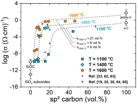 Figure 5 shows the (logarithmic) room temperature dc conductivity of the SiOC/C samples synthesized at temperatures in the range from 1000 to 1600 °C as a function of the content of sp2-hybridized segregated carbon. It is clearly seen that the dc conductivity shows a dependence on the sp2 carbon content in SiOC/C, which may be correlated to percolative systems. The critical concentration ϕcri. (percolation threshold) of sp2 carbon is shown to depend on the annealing temperature and varied from ca. 20 vol.% for the sample series prepared at 1000 °C to ca. 6 vol.% for the samples annealed at 1600 °C (Figure 5). It is tempting to attribute the decrease of the percolation threshold to an increase in the aspect ratio of the segregated carbon phase, as the threshold typically depends on the shape of the conductive filler in many composite materials [53,54,55]. For instance, Cordelair et al. computed in a case study the insulator–conductor transition in SiOC/C-based materials, showing that the percolation threshold decreases from 20 to 5 vol.% as the shape of the conductive filler is changed from spherical to rod-like [35]. However, no reliable information on the aspect ratio can be obtained for SiOC/C, due to the random 3D carbon morphology and the lack of suitable characterization methods.