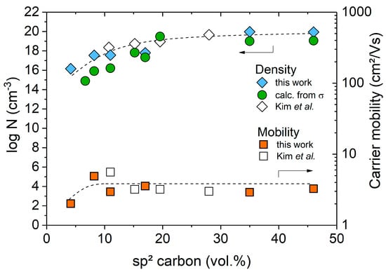 Charge carrier density (N) and mobility (μ) in SiOC/C materials prepared at T = 1600 °C; the empty symbols represent data from a case study published by Kim et al. [76].
