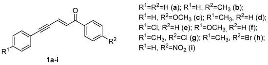 In our previous work, we studied a multicomponent reaction of linear conjugated enynones, 1,5-diarylpent-2-en-4-yn-1-ones, with malononitrile and sodium alkoxides affording substituted pyridines [3]. In that study [3], we showed just one example of the synthesis of multisubstituted cyclohexane by the reaction of 1,5-diphenylpent-2-en-4-yn-1-ones with malononitrile using lithium diisopropylamide (LDA), as a base, instead of sodium alkoxides. We decided to investigate this intriguing reaction deeper. Thus, the main goal of the current work was to study the reactions of 1,5-diarylpent-2-en-4-yn-1-ones 1a-i (Figure 1) with malononitrile in the presence of LDA. We also tried to isolate some intermediate structures to elucidate the reaction mechanism.