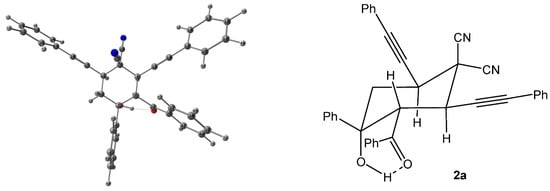 (2RS,3SR,4RS,6SR)-4-Hydroxy-3-(oxophenylmethyl)-4-phenyl-2,6-bis(phenyletynyl)cyclohexane-1,1-dicarbonitrile (2a) [3]. Obtained from 1a (100 mg, 0.44 mmol) in a yield of 70 mg (60%). Obtained from 1a (50 mg, 0.22 mmol) and malononitrile 14.5 mg (0.22 mmol) in a yield of 26 mg (45%). Obtained from 1a (50 mg, 0.22 mmol) and malononitrile 14.5 mg (0.22 mmol) at −40 °C in a yield of 28 mg (48%). Obtained from 1a (50 mg, 0.22 mmol) and malononitrile 14.5 mg (0.22 mmol) at −70 °C in a yield of 10 mg (17%). Colorless solid. 1H NMR, δ, ppm: 2.40 s (1H, OH), 2.42–2.43 m (1H, CH2), 4.06 dd (1H, CH-CH2, J = 5.9, 9.9 Hz), 4.16 d (1H, CH-CH-CO, J = 11.6 Hz), 4.60 d (1H, CH-CO, J = 11.5 Hz), 5.24 s (1H, CH2), 6.97 d (2H, HPh, J = 7.3 Hz), 7.13–7.19 m (3H), 7.22–7.27 m (3H), 7.35–7.47 m (7H), 7.52–7.57 m (3H), 7.88 d (2H, HPh, J = 7.7 Hz). 13C NMR, δ, ppm: 34.3 (CH-CH2), 37.3 (CH2), 42.0 (C-(CN)2), 46.2 (CH-CH-CO), 49.9 (CH-CO), 73.8 (C-OH), 82.2 (C≡), 83.9 (C≡), 86.7 (C≡), 89.4 (C≡), 112.4 (CN), 113.9 (CN), 120.9, 121.7, 124.4, 128.0, 128.1, 128.3, 128.66, 128.71, 128.8, 129.0, 129.1, 131.7, 132.1, 134.4, 137.2, 142.8, 202.8 (CO). IR (KBr): 1662 cm−1 (CO), 2239 cm−1 (CN, C≡C), 3442 cm−1 (OH…O). HRMS (ESI-TOF) m/z: [M + Na]+ Calcd for C37H26N2O2Na 553.1892; Found 553.1886. X-ray of 2a were given previously [3].
