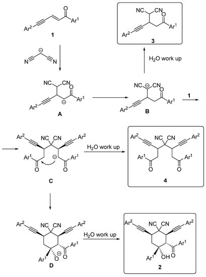 A plausible reaction mechanism is presented in Scheme 2. The Michael addition of malononitrile anion to the carbon–carbon double bond of enynone 1 gives rise to anion A, which is isomerized into anion B. Aqueous work up at this reaction step affords compound 3. Anion B may react with one more molecule of 1 affording anion C, and this stage goes stereoselectively. Work up to at this stage provides compound 4. Cyclization of anion C into species D forms cyclohexane ring. This stage proceeds very stereoselectively, furnishing only one stereoisomer of 2. Finally, aqueous workup of anion D results in the formation of compound 2.