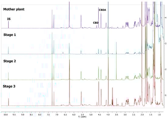1Η-NMR spectra of mother plant with high concentration in cannabidiolic acid (CBDA) (top) and in vitro cultivated plants in three stages of growth.