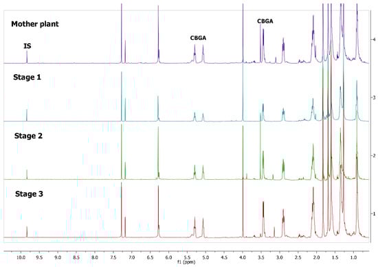 1Η-NMR spectra of mother plant with high concentration in CBGA (top) and in vitro cultivated plants in three stages of growth.