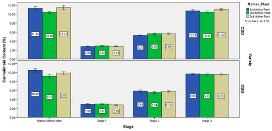 The chemical profiles of flower samples taken from healthy, high yielding cannabidiol and cannabigerol respectively, mother plants were randomly selected from three different field plots as shown in Figure 3. The chemical profiles of mature flower samples taken from the fully acclimatized of in vitro cultured clones at three different growth stages are shown in Figure 3, too. Both CBD+CBDA and CBG+CBGA content of the clones from each mother plant was increasing as plant age was approaching maturity, reaching its highest level during harvesting stage (Figure 3, please see Table S1 in Supplementary Materials). The highest concentration of CBD+CBDA and CBG+CBGA content of acclimatized in vitro micropropagated plants was found at 11.41% and 10.01% respectively, during the third (harvest) stage i.e., 130-day-old plants since the time that they were first placed in in vitro conditions. The highest concentration of CBD+CBDA and CBG+CBGA content of mother plants was found at 11.47% and 10.49% respectively.