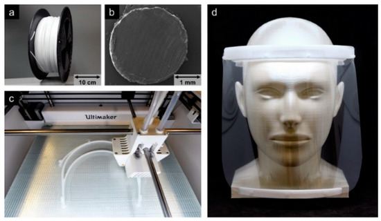 Extruded polypropylene (PP) filament on a spool (a) and SEM image of the cross-sectional area of the filament (b) applied for 3D printing of sterilizable and reusable headbands for face shields (c,d) during the COVID-19 pandemic for use as protective equipment at the medical center Freiburg, Germany, manufactured from a PP with certified biocompatibility (USP class VI).
