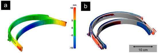 The predicted deformation by simulation after the 3D printing process based on the original geometry (a). 3D scan of the printed medical-grade polypropylene headbands based on the original Prusa templates (red) and based on the optimized template (blue) in comparison to the original STL file (grey) (b). The optimized headbands exhibited a better fit by compensating for the warpage and could be printed in large numbers without faulty rejects due to the process optimization.