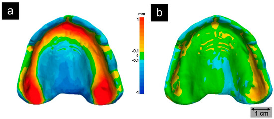 Target-actual comparison of the intaglio surface of a FFF printed denture base made of medical-grade PP applying standard PP printing conditions (a) and a warpage-optimized PP with reduced crystallinity after 3D printing process optimization in terms of pre-deformed, warpage-compensating CAD files and temperature management (b). Printed denture bases were digitized (VL 500, Keyence, Osaka, Japan) and compared to the original STL file with an inspection software program (Geomagic Control X, 3D Systems, Rock Hill, SC, USA). The data of the intaglio surfaces was superimposed with the data of the original by using a local best-fit algorithm according to Gauss. Subsequently, a 3D surface comparison was carried out and the discrepancies were illustrated using a color map with a tolerance of ±100 µm (green).