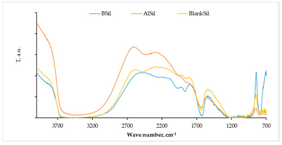 Fourier transform infrared (FTIR) spectra of the blank matrix and matrices with the immobilized catalysts BF3 and AlCl3. BSil—blue, AlSil—orange, BlankSil—yellow.