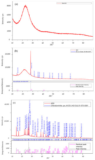 X-ray diffraction (XRD) analysis of the immobilized catalysts (a) BlankSil; (b) BSil and (c) AlSil.