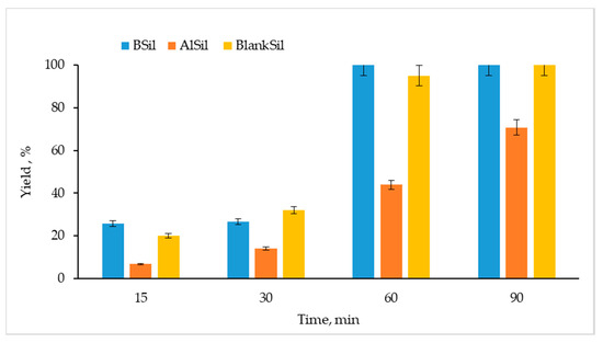 Immobilization of the catalysts led to a certain decrease in their catalytic performance compared to free catalysts. In our previous study, OA esterification was performed for 15 min under ultrasonic activation using the free catalyst AlCl3, gaining a 100% yield [12], whereas only a 7% yield was obtained using the immobilized catalyst AlSil in the same reaction for the same length of time (Figure 5). This phenomenon can probably be explained not only by poor availability of the reagents to AlCl3 in the matrix, but also by a hydrated form of AlCl3 in chloraluminite. A reduction in the reaction yield was also observed for the catalyst BF3: a 100% yield was obtained for the free catalyst after 15 min of reaction catalyzed by BSil, compared to a 25% yield when using the immobilized catalyst under the same reaction conditions. At the same time, it should be mentioned that direct comparison between the free and immobilized BF3 is problematic, since BF3 was converted into boron oxide during the course of immobilization. However, a 100% yield of esterification can be achieved within reasonable time periods under ambient conditions, opening prospects for continuous production of biodiesel. Even in the case of AlCl3, which in its free form is considered a heterogeneous catalyst, immobilizing it into a sol–gel matrix makes sense, since AlCl3 possesses limited solubility in methanol [33] and may leak from the continuous reactor when applied in its free form.