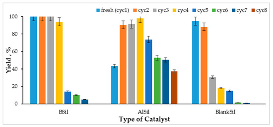 The efficiency of the esterification reaction was tested after eight cycles of catalyst use. As shown in Figure 6, BSil maintained its high ability to catalyze the reaction for four cycles, providing almost 100% yield of the product, while BlankSil was highly active only in two cycles. Surprisingly, the AlSil matrix was active for all eight cycles, where the reaction efficiency increased with repeated use. Ultrasonic processing probably caused grinding of the sol–gel powder particles, thus increasing the surface area of the catalyst and providing better contact between the reagents and the catalyst.