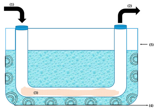 Scheme of the experimental setup for continuous biodiesel production under ultrasonic activation. (1)—Inlet; (2)—outlet; (3)—matrix; (4)—ultrasonic transducer; (5)—ultrasonic bath.