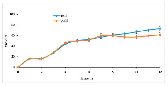 The performance of the catalysts BSil and AlSil in a continuous mode was tested using a fixed-bed flow reactor. The scheme of the experimental apparatus is shown in Figure 7. The mixture of reagents flowed through a glass tube filled with matrices and the samples collected at the outlet were analyzed by HPLC. The results of the experiments are presented in Figure 8. At the initial period of the experiment, when the reactor operated in a transition state, the product yield was very low, since before the experiment the reactor contained only solvents, and the product at the outlet was very diluted. After 7–9 h in both cases, the process reached a stationary state and the efficiency of the reaction reached satisfactory yields of 58.8 ± 1.9% for AlSil and 68.6 ± 4.1 for BSil, where the advantage of BSil was statistically confirmed by a p-value of 0.006. The experiment results proved a principal possibility of continuous biodiesel production under ultrasonic activation using sol–gel immobilized catalysts.