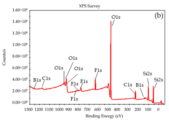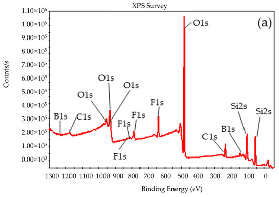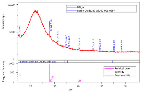 Since the catalytic performance of the BSil matrix was the highest in both batch and continuous modes, it was decided to characterize this matrix after use by XRD and X-ray photoelectron spectroscopy (XPS). Figure 9 presents the XRD pattern of the used BSil, which was very close to that of a freshly prepared matrix (Figure 3b), showing the presence of the boron-based catalyst within the matrix of the used catalyst.