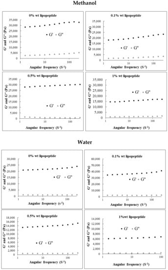 Storage (G′, closed circle) and loss (G′′, open triangle) moduli of the gel samples containing different concentrations of the lipopeptide prepared in methanol (top four graphs) and water (bottom four graphs).