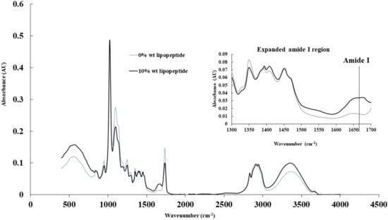 Successful conjugation of the lipopeptide onto the gel matrix was confirmed by FT-IR spectroscopy (Figure 2). With 10 wt% lipopeptide in methanol, a peak at 1668 cm−1 was observed. This peak corresponds to the amide I region and is mainly associated with carbonyl vibrations arising from the peptide molecules. The 10 wt% lipopeptide in water also observed a peak at 1641 cm−1 corresponding to amide I region (Figure S4). This characteristic peak was absent in the control gel sample devoid of the lipopeptide (0 wt% lipopeptide.) At lower lipopeptide concentrations (0.1–1 wt%) the gels did not show the characteristic amide I and II bands possibly due to reduced lipopeptide concentration to yield any detectable signal [].