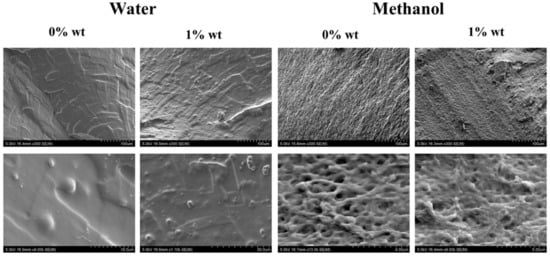 Representative SEM images of gels in the absence (0 wt%) and presence (1 wt%) of the lipopeptide. The top panel shows images taken at a magnification of 300× and the bottom panel at a magnification of 1000 to 4000× for the water samples and 9000 to 13,000× for the methanol samples.