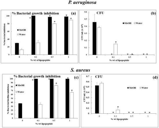 The lowest weight percent of the peptides that showed antimicrobial activity in the hydrogels reported by Cleophas et al. was 10 wt% (relative to polymer content) against S. aureus, S. epidermidis and E. coli [,]. Our lipopeptide gels showed excellent antibacterial activity at a peptide content 100 times lower (0.1 wt%) against P. aeruginosa and S. aureus. Lipopeptide gels prepared in methanol showed up to 97% bacterial growth inhibition (Figure 4a,c) against the two pathogens. In fact, no live bacteria were recovered from the samples (Figure 4b,d). These results indicate that the antibacterial activity of these lipopeptide gels are initiated upon bacterial contact (contact killing) with the gel sample. However, only 0.5 and 1 lipopeptide wt% hydrogels in water showed potent antibacterial activity against P. aeruginosa and S. aureus. The discrepancy in the antibacterial activity between the gels prepared in methanol and water could be due to poor solubility of PEG matrix in water, as described earlier. The control PEG only gel (0 wt% of the lipopeptide) showed weak antibacterial activity against the two pathogens, possibly due to the antiadhesive properties of PEG. Weak antibacterial activity of PEG coated surfaces has been observed in our previous work [].